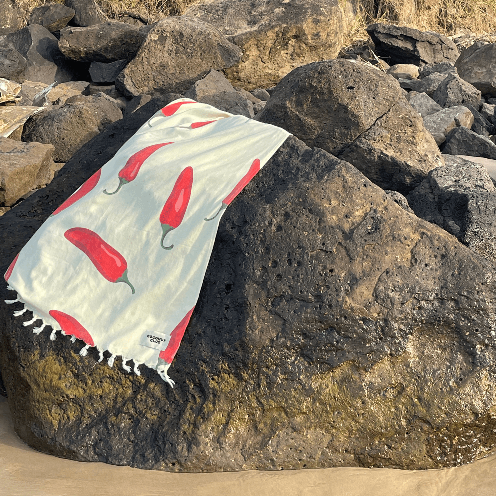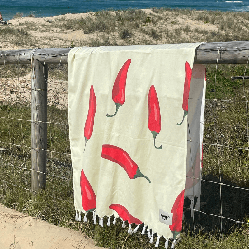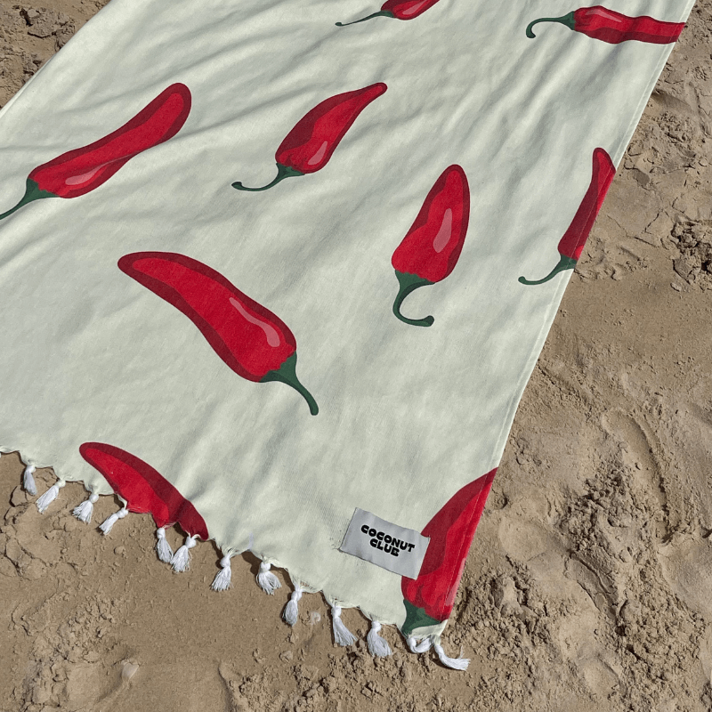 Some like it hot. Our Spicy Chilli Turkish Towel Brings a punch of spice to your beach days. This design is more than just a pattern it’s an ode to flavour, passion, and adventure. Whether draped over sun-kissed shoulders or spread out on warm sand, it brings an effortless energy to any moment. Timeless yet playful, it's a towel made for those who like a little spice in their life